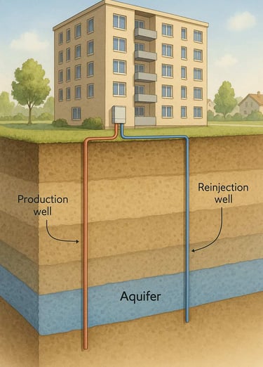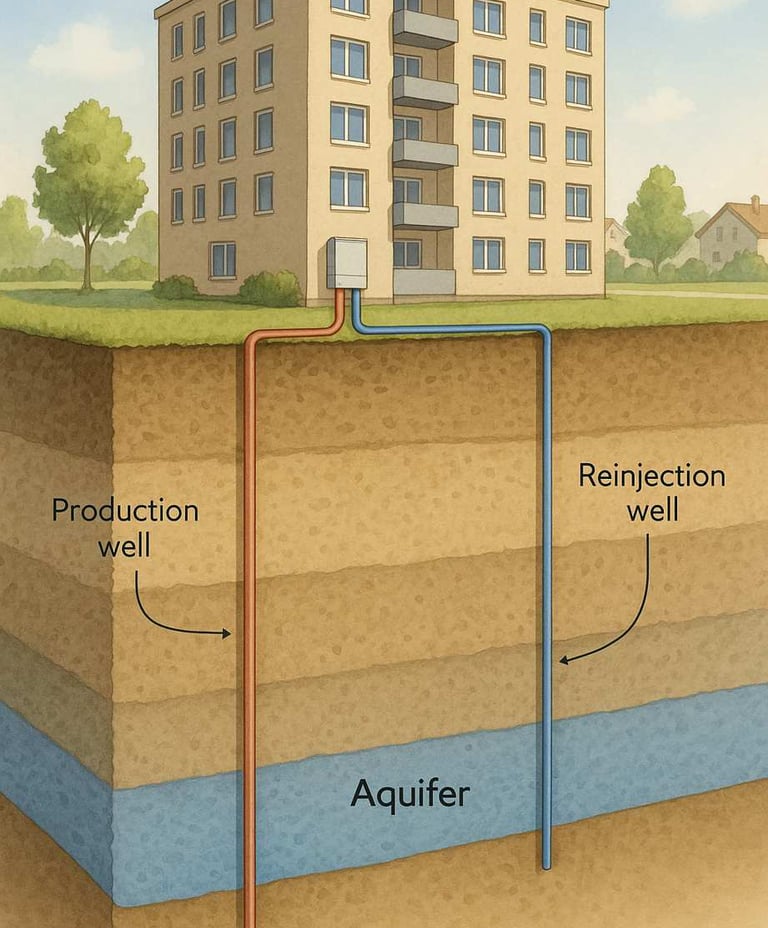 C’est un système qui utilise l’eau souterraine comme source d’énergie : on pompe l’eau dans la nappe, elle échange sa chaleur (ou sa fraîcheur) via une pompe à chaleur géothermique, puis elle est réinjectée dans la nappe. L’eau n’est pas consommée, elle circule en boucle.